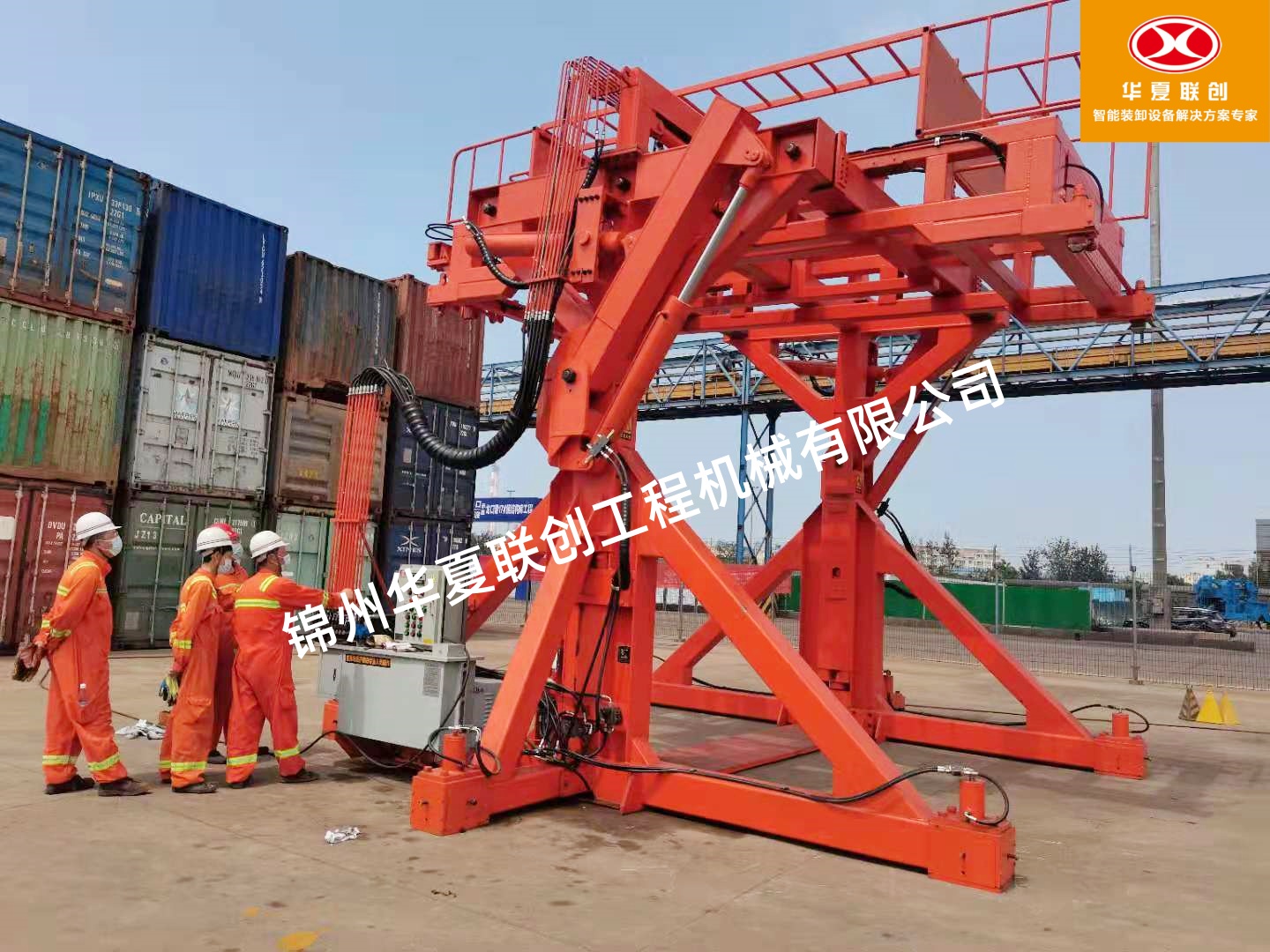 華夏聯(lián)創(chuàng)牌集裝箱翻轉(zhuǎn)機(jī)節(jié)能、高效、安全、智能、舒適、可靠,廣泛運(yùn)用于倉儲物流、礦山、工程、糧庫、港口碼頭等領(lǐng)域,可裝載糧食、塑料碎片、金屬碎片、礦石、煤焦等多種散裝物料。本品為全液壓結(jié)構(gòu),操作方便,適合20英尺集裝箱裝箱、卸箱,裝箱速度快,作業(yè)成本低,使散貨裝箱變得更簡單、輕松、快捷。以電機(jī)為動力,電機(jī)功率18.5千瓦,具有噪音低,振動小特點。采用國內(nèi)知名品牌液壓油缸,加粗缸徑,起重量大,起升及翻轉(zhuǎn)平穩(wěn)、安全等特點。